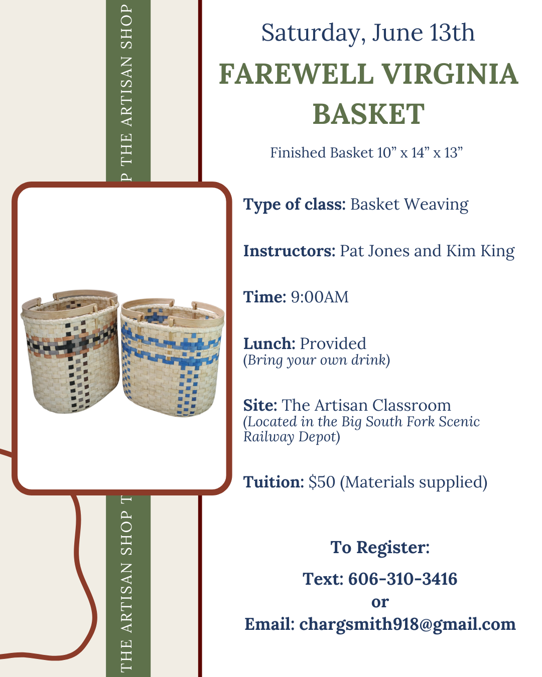 Instructors: Pat Jones and Kim King Lunch Provided – Bring your own drink Skill Level: Advanced Beginner Class Limit: 10 To Register: Text 606-310-3416 or EMAIL chargsmith918@gmail.com