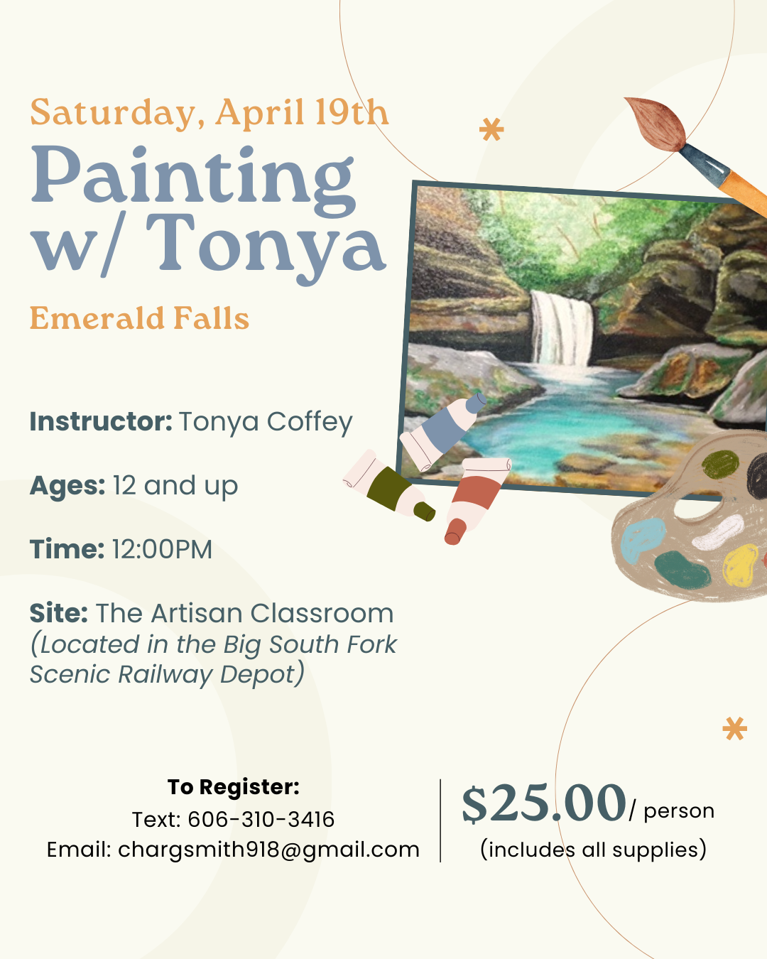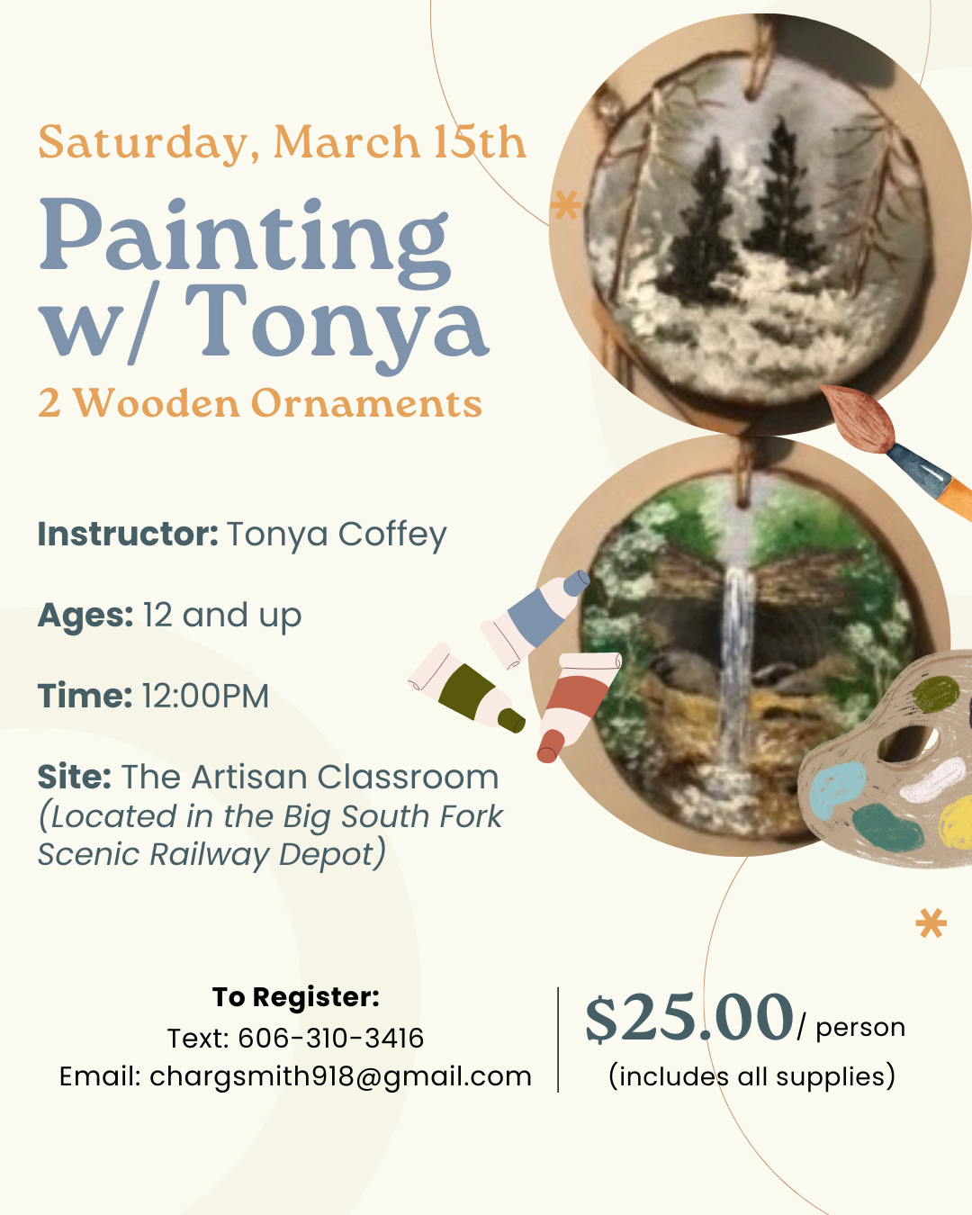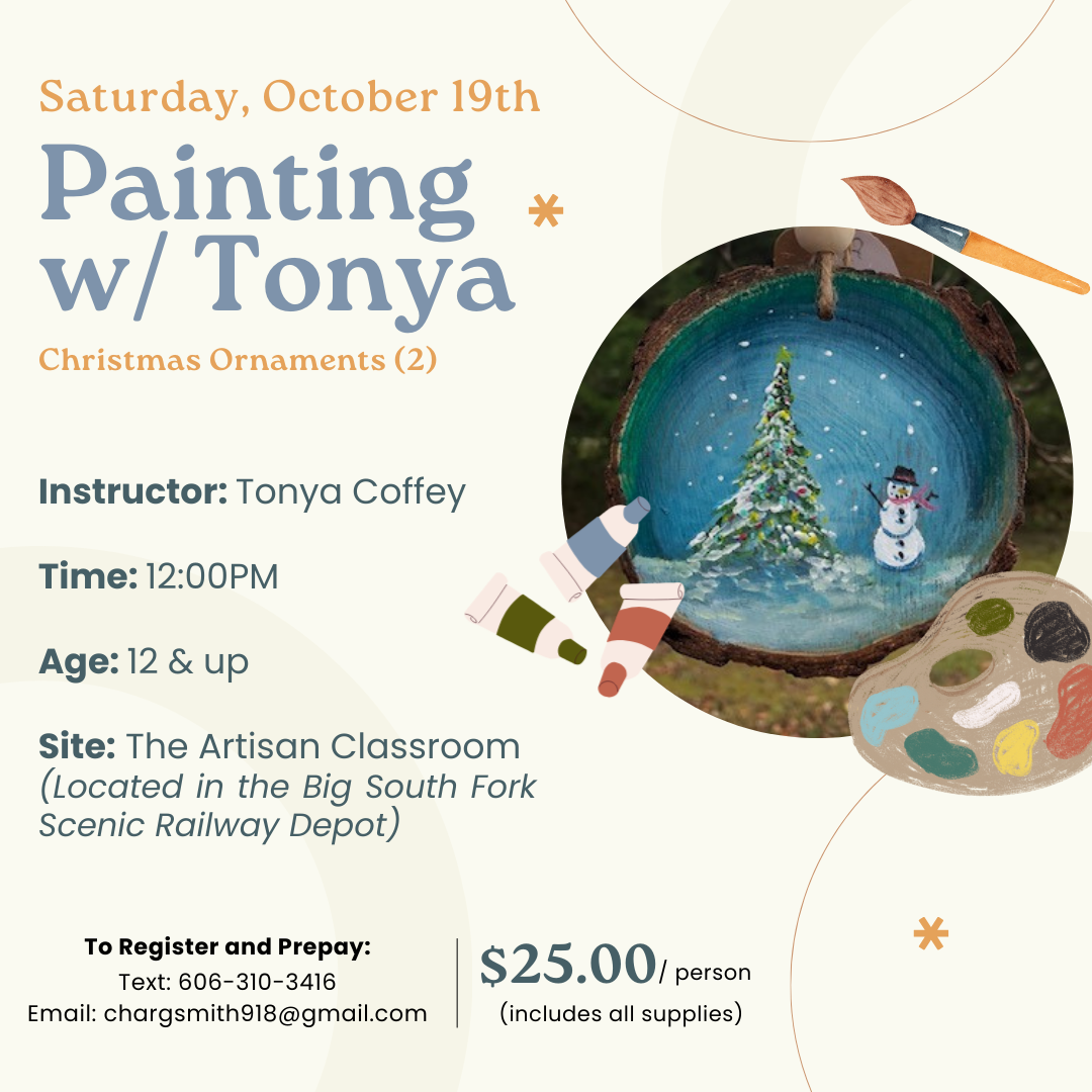 Instructor: Tonya Coffey Ages: 12 and up Time: 12:00 PM Site: The Artisan Classroom located in the Big South Fork Scenic Railway Depot Tuition: $25 (includes all supplies) To Register: Text 606-310-3416 or EMAIL chargsmith918@gmail.com