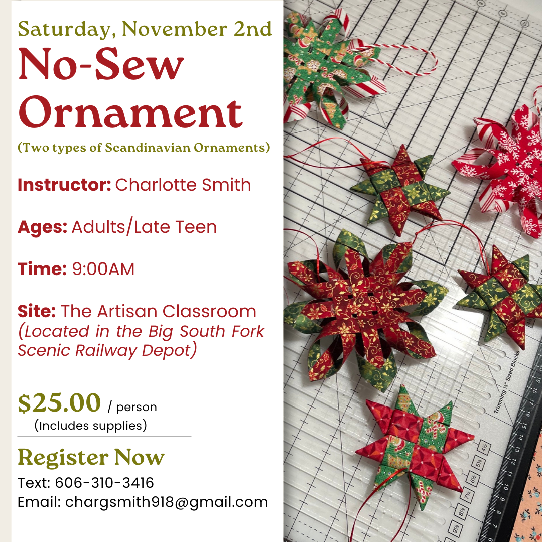 Instructor: Charlotte Smith Time: 1:00-4:00 PM Site: The Artisan Classroom located in the Big South Fork Scenic Railway Depot Tuition:$30 Skill Level: Beginner Class Limit: 10 To Register: text 606-310-3416 or email chargsmith918@gmail.com