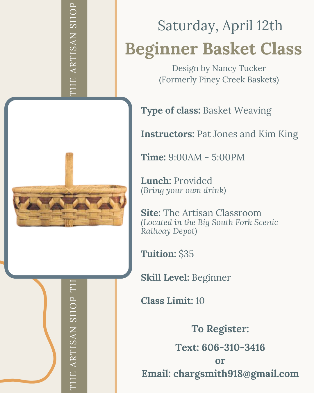 Pattern created by Nancy Tucker (formerly Piney Creek Baskets)Instructors: Pat Jones and Kim KingLunch provided – bring your own drink Tuition: $35 Class limit: 10To register: text 606-310-3416 or email chargsmith918@gmail.com